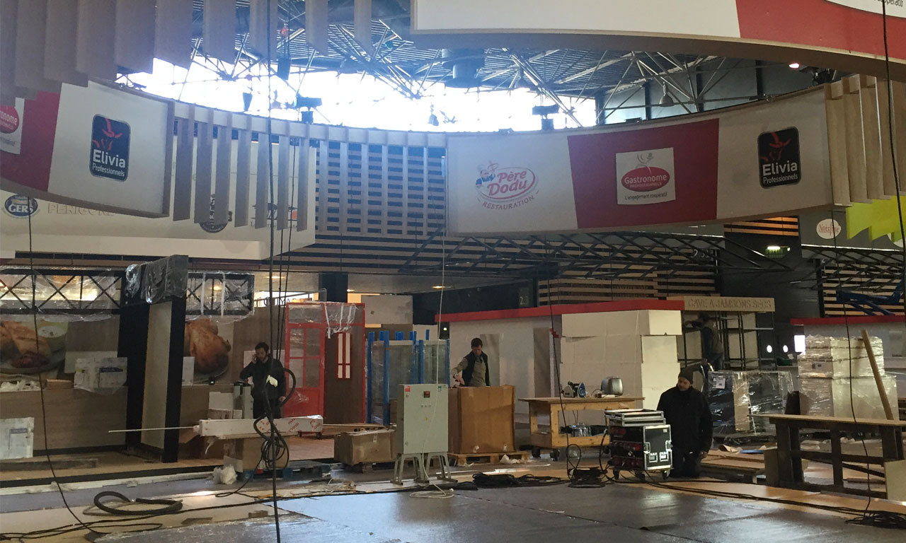 La difficulté s’est présentée dans le dispatching des surfaces allouées à chaque marque, car aucune ne devait être lésée. Le salon étant sur l’alimentaire, des espaces dégustations devaient exister. Nous avons opté pour un bar assez important avec une cuisine adjacente. De nombreux produits devaient être présentés. Chaque marque a son point d’accueil avec ses produits mis en valeur dans une vitrine à hauteur d’œil, et avec un paravent « support de communication grand format ». Avec sa signalétique haute, le stand est repérable depuis l’entrée du salon, et depuis toutes les allées. Son côté architecturé reprend l’idée des ailettes des paravents. Nous avons utilisé des matériaux évoquant la nature, le terroir : bois, décoration florale, bottes de paille.